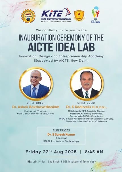 The AICTE IDEA Lab (Innovation, Design and Entrepreneurship Academy), supported by AICTE, New Delhi, was inaugurated on Friday, 22nd August 2025 at KGiSL Institute of Technology, Coimbatore. The IDEA Lab aims to foster creativity, innovation, and entrepreneurship among students by providing hands-on learning experiences through modern tools and technologies. The inauguration ceremony was graced by distinguished Chief Guests: